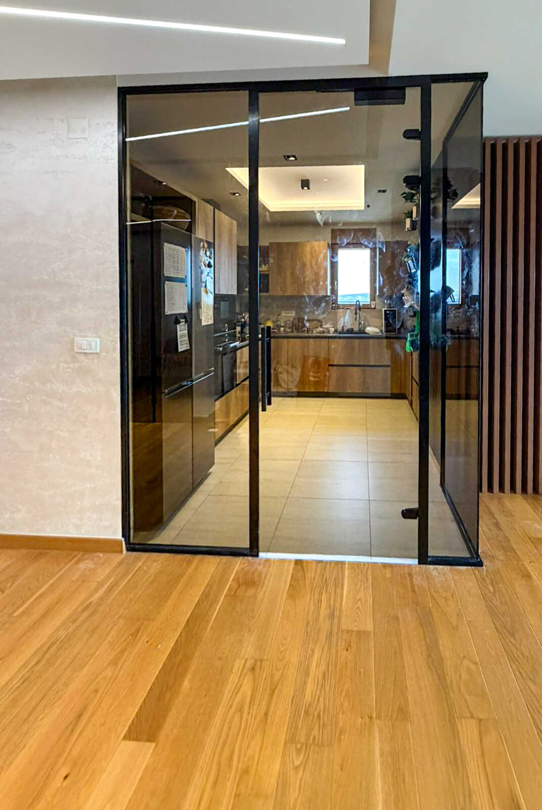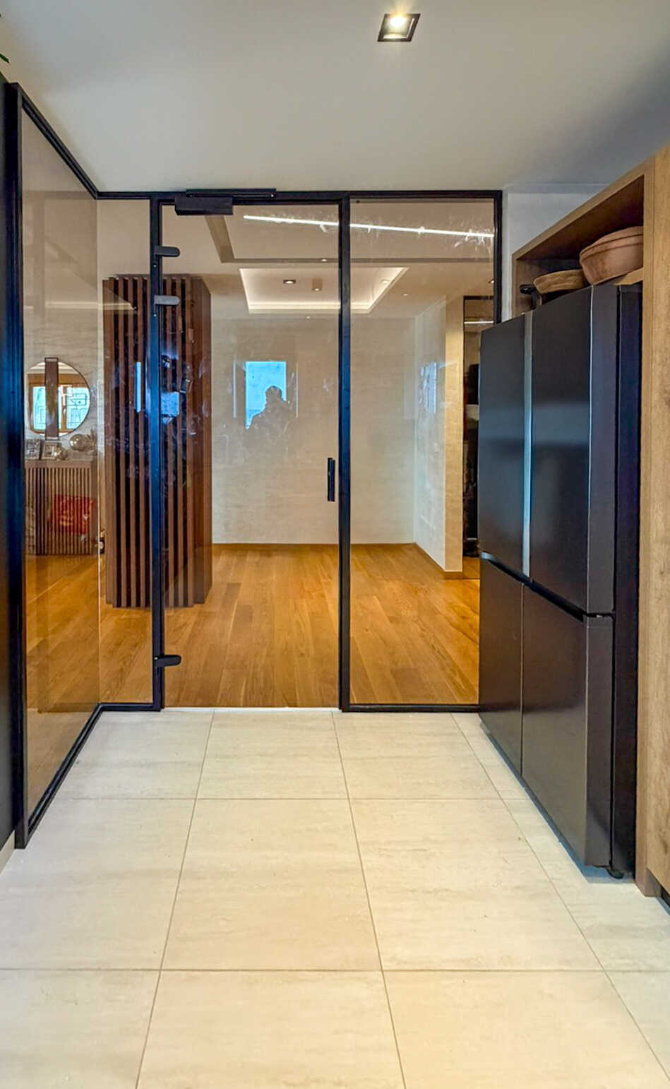 Stakleni zidovi formiraju vezu sa zidom , podom i plafonom uz pomoć Flipp profila za staklene zidove kreirajući simetričan dizajn.